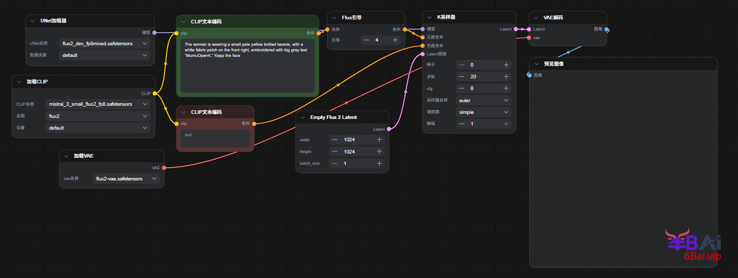 5、最后将采样输出latent使用vae解码输出,输入合适的提示词,不需要输入负面。另外还需要将cfg值设置为1,这与flux1是完全相同的。如图所示: